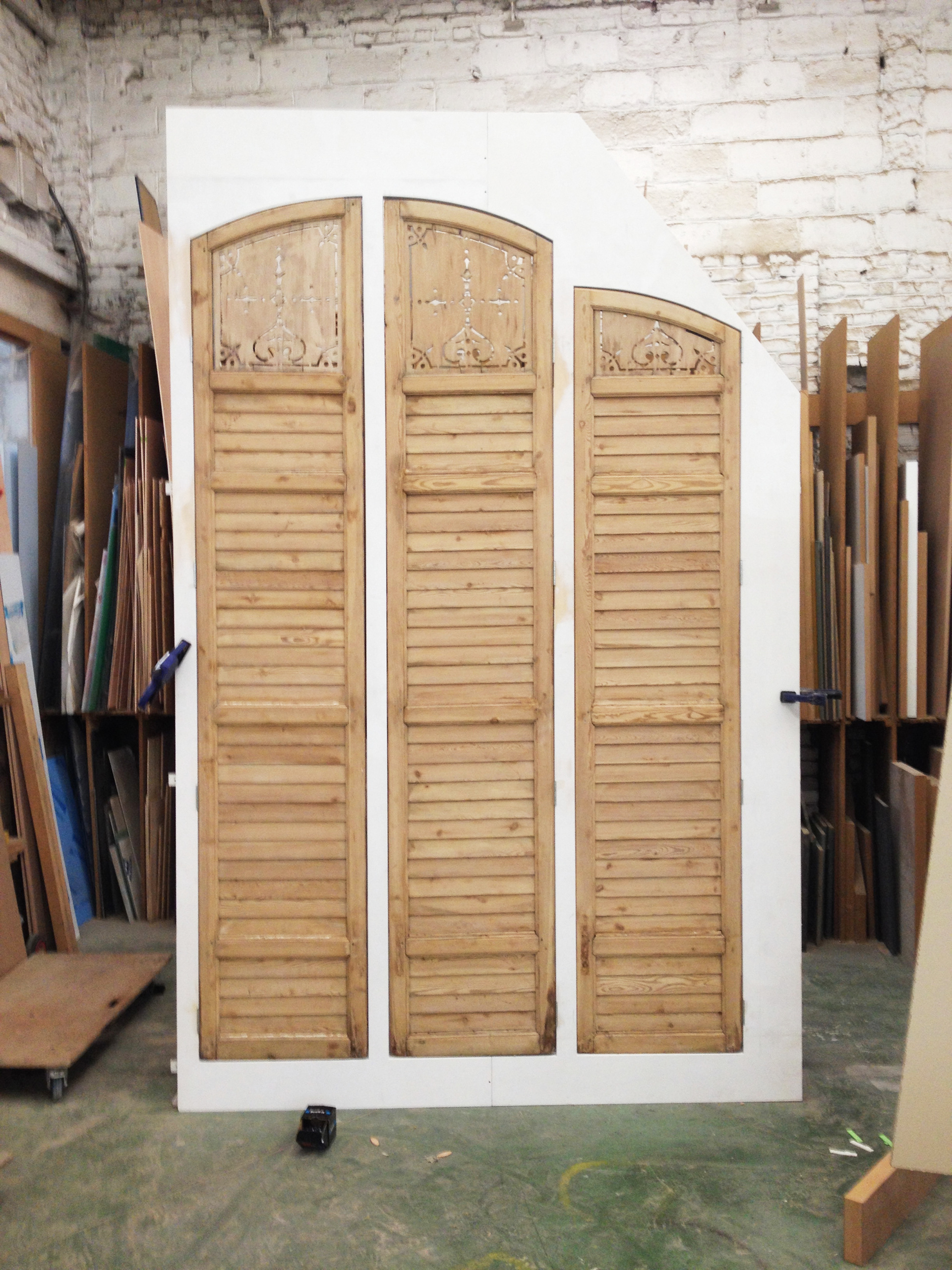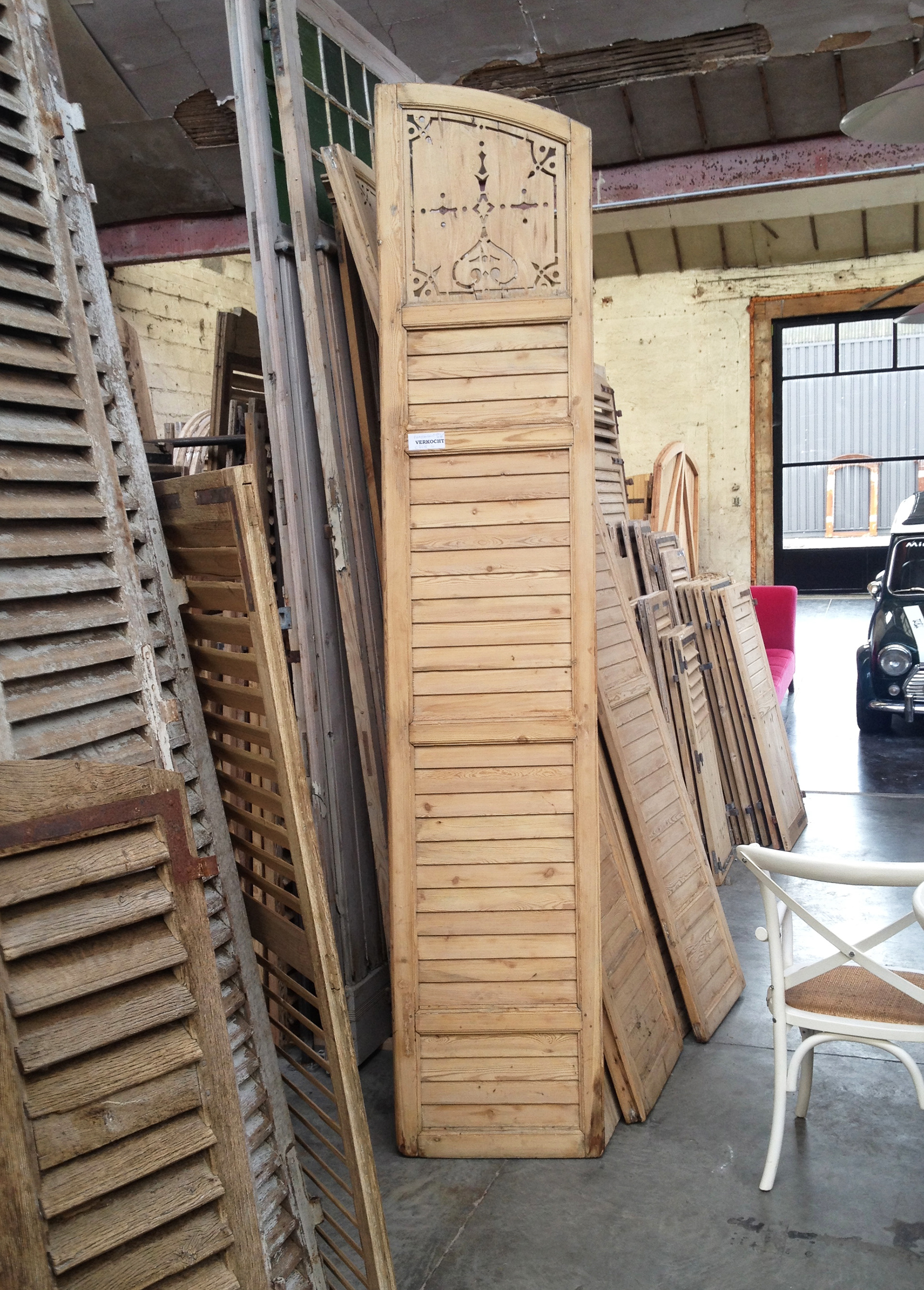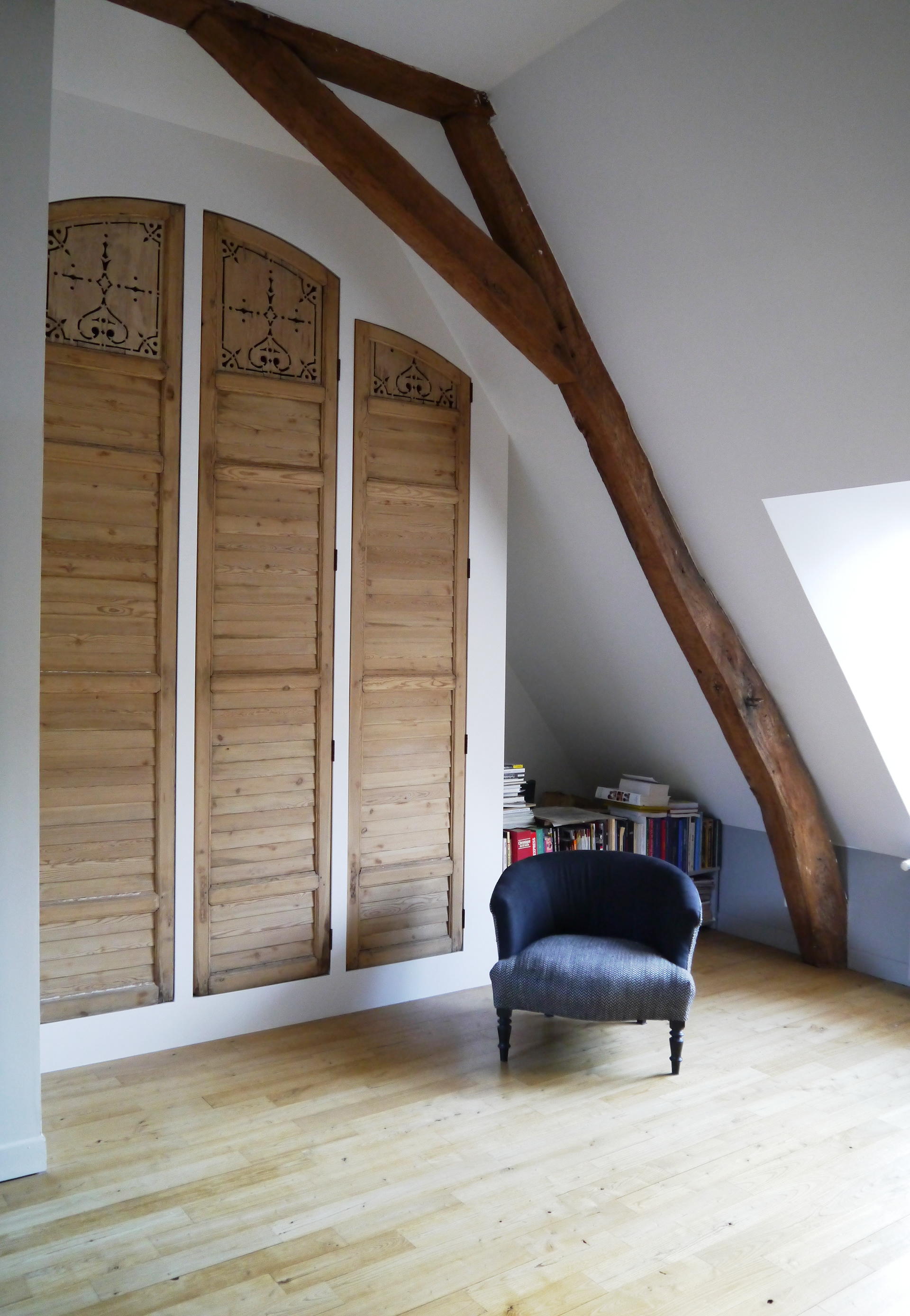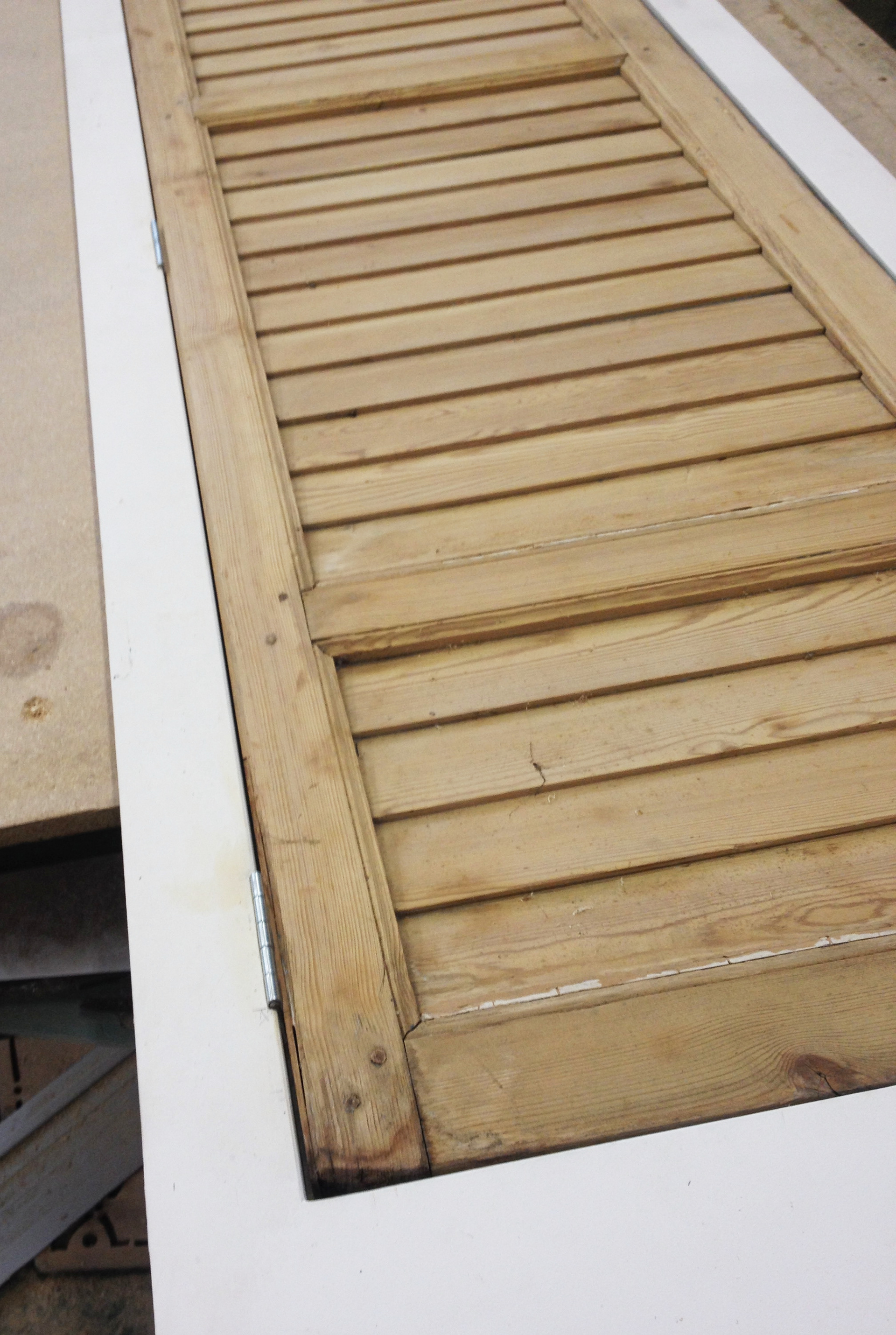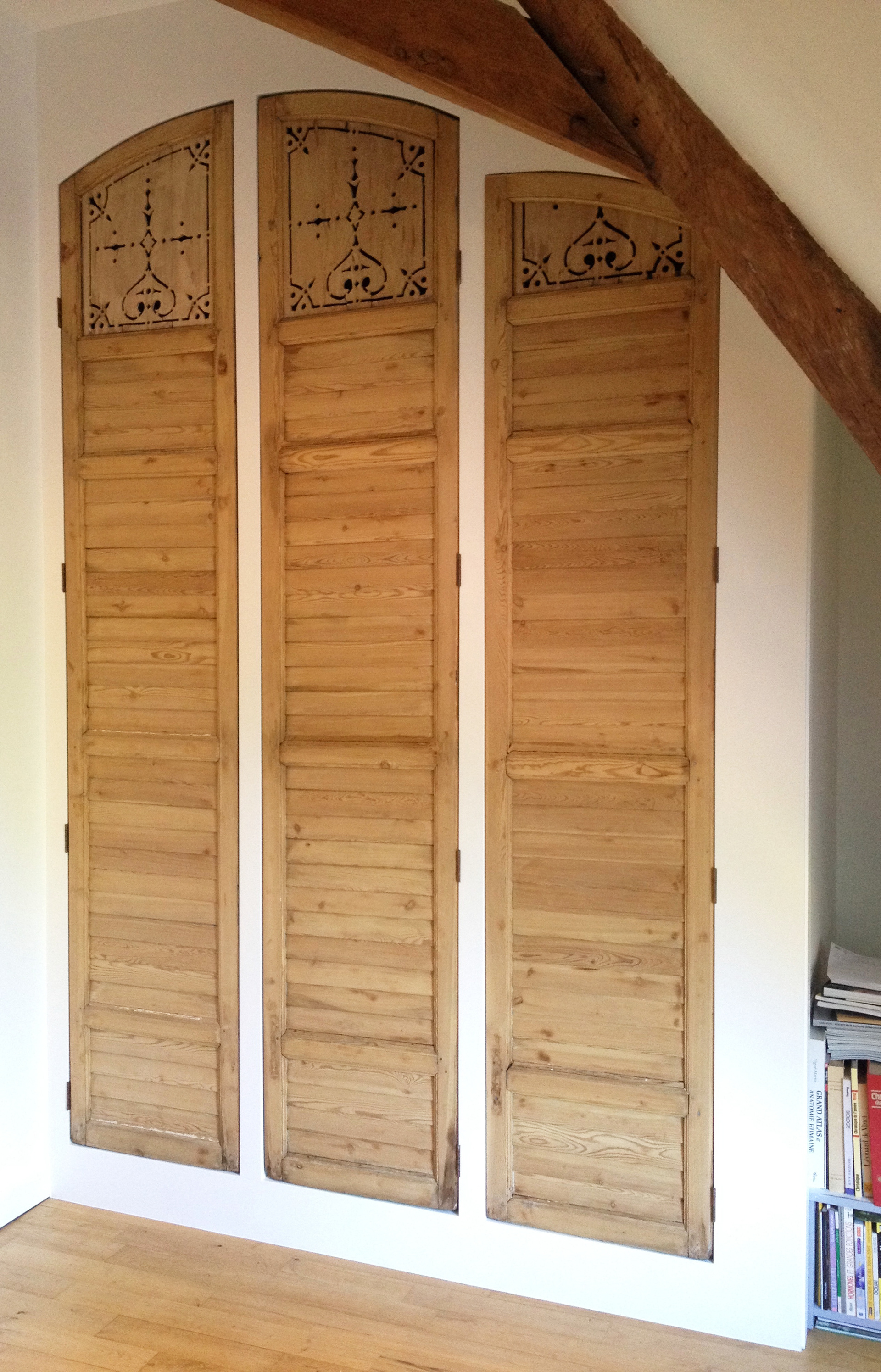 Le défi consistait à dissimuler un dressing en melaminé noir peu esthétique derrière une série de volets anciens chinés chez un brocanteur. Sélection des volets - conception de la façade de dressing - fabrication de l'ensemble - pose.