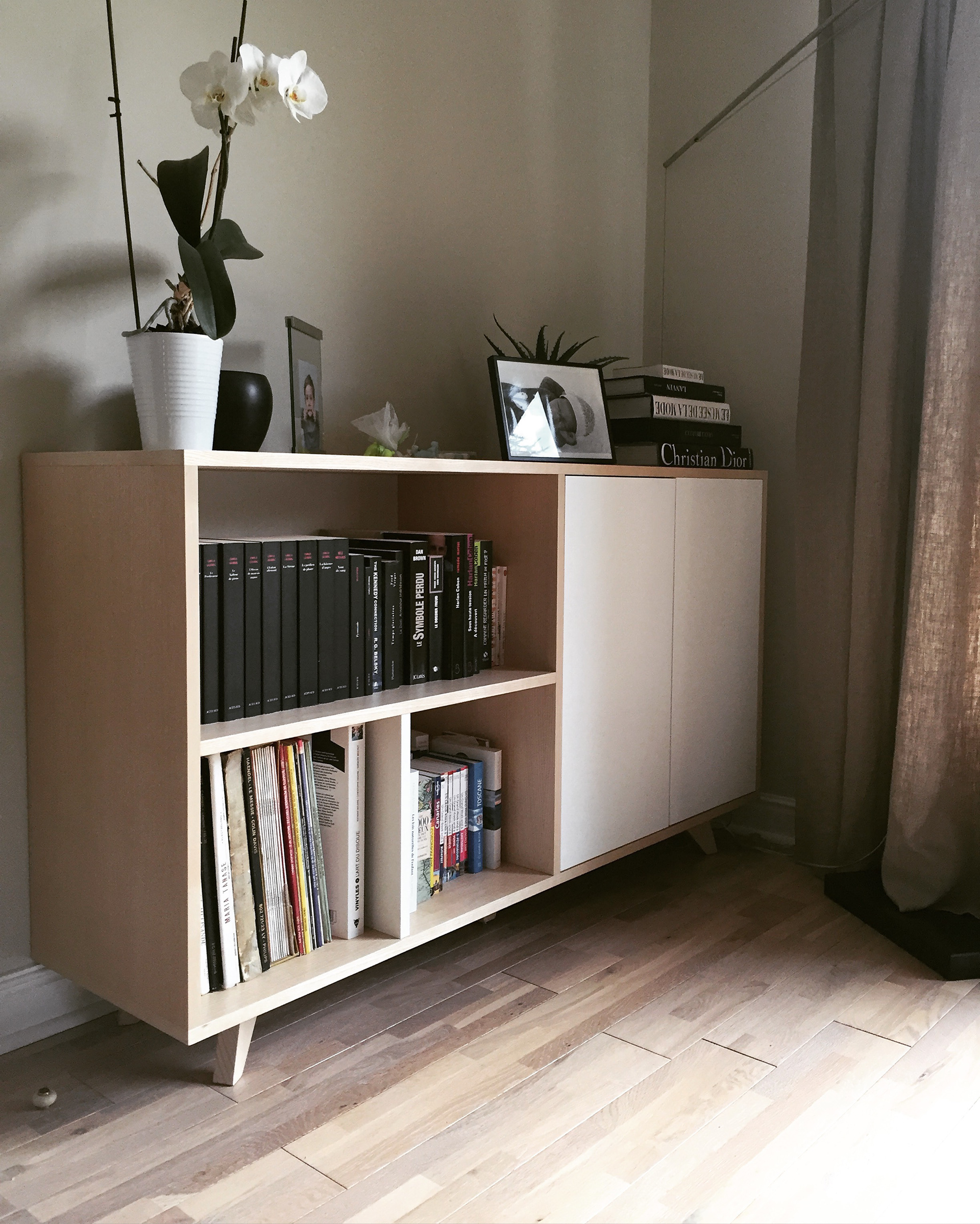 Conception et réalisation de 2 meubles et d'une étagère en panneau agglomérés plaqués frêne et MDF laquées blanc afin de ranger une belle collection de 33 tours et de livres.